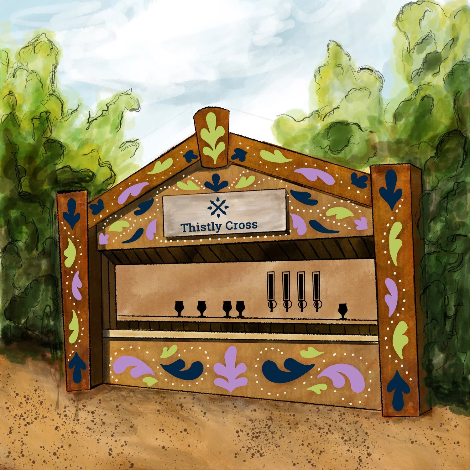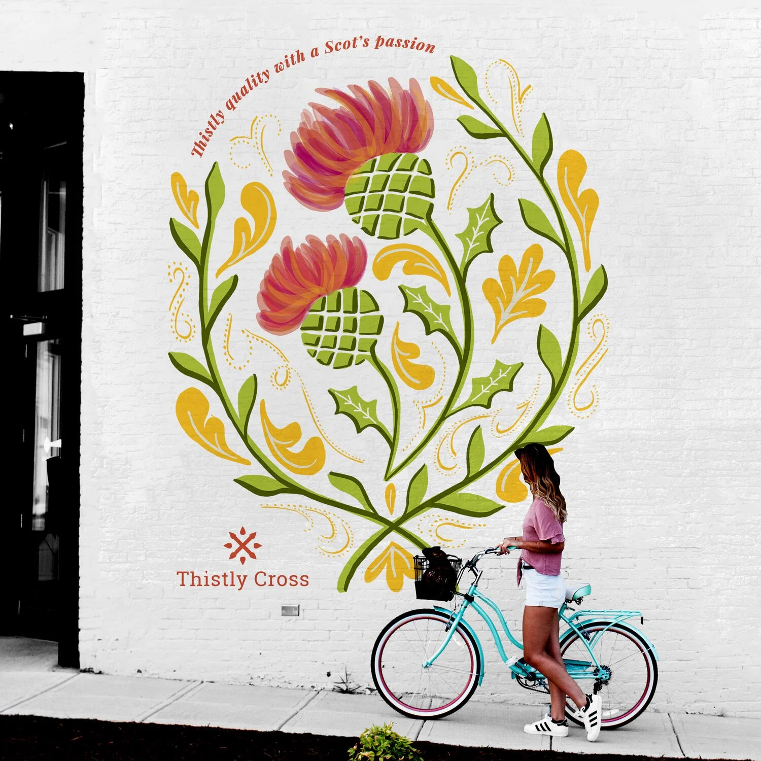 The rebrand includes a redesigned logo, cider labels, cider tank wraps, festival booth design, mural design, sweatshirt, poster, and illustrations that connect to native Scottish floral elements.